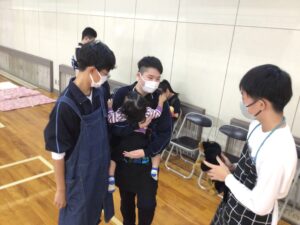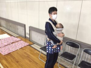 担当のお子さんを大事そうに抱っこする中学生のお兄さん、