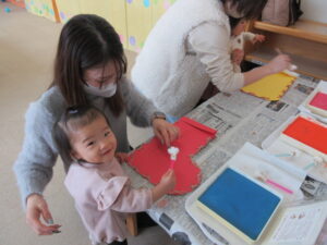 ちゃんと好きな色を知ってるみんな~❔❔ 大きな画用紙を手に持って、とってもにこにこ😊😊