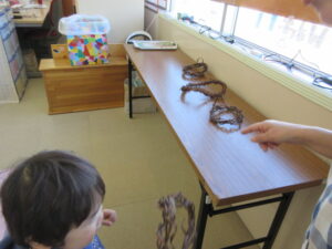 さつまいものつるにリースに毛糸をぐるぐる巻いてね