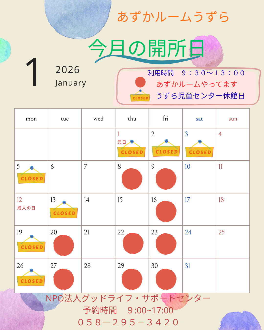あずかルームうずら 1月開所日